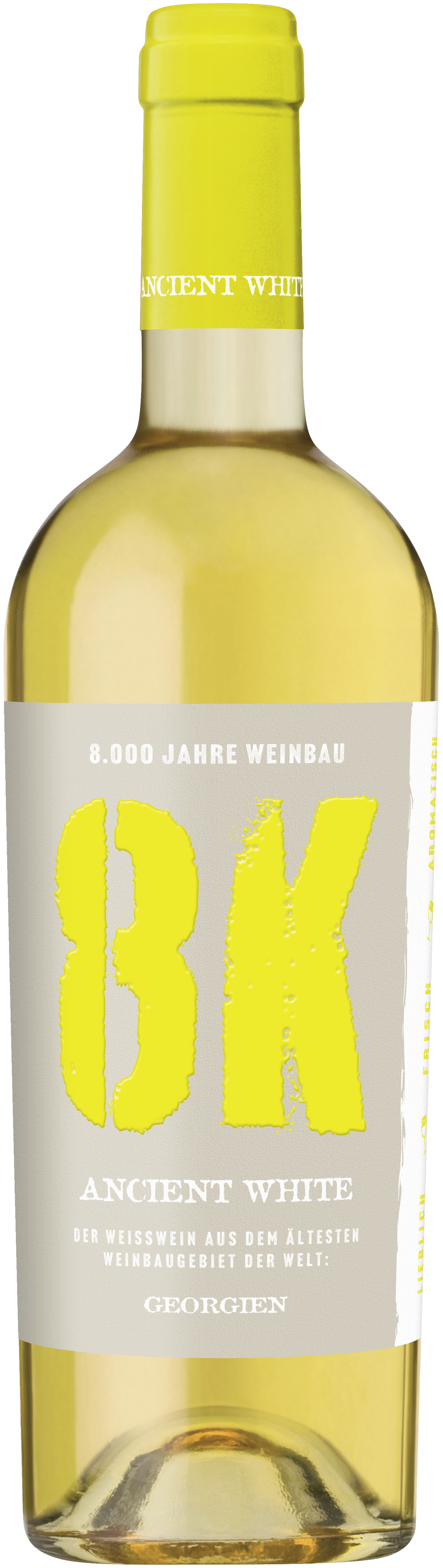 8K – die Abkürzung für 8.000 Jahre. Ein charaktervoller Weißwein aus der traditionsreichen Rebsorte Rkatsiteli, zum Teil vinifiziert nach der jahrtausendealter georgischer Methode in Qvevris. Frischer aromatischer Geschmack mit feiner Säurestruktur. In der Nase zeigen sich Aromen von getrockneten Aprikosen, unterlegt von einer leichten Würze und erdigen Noten. Am Gaumen ist er trocken, vollmundig, mit einer ausgewogenen Säure. Passt hervorragend zu sommerlichen Salaten oder gegrilltem Fisch.