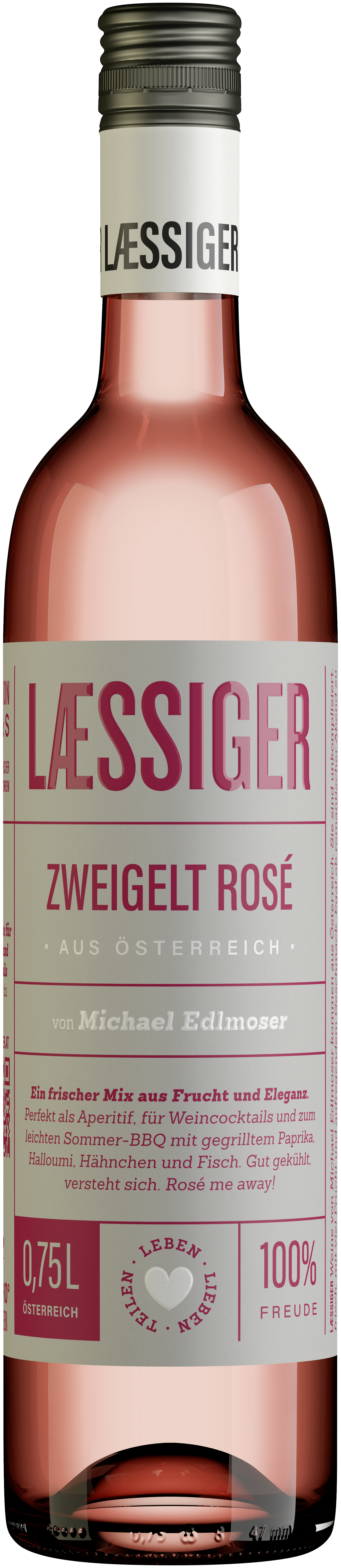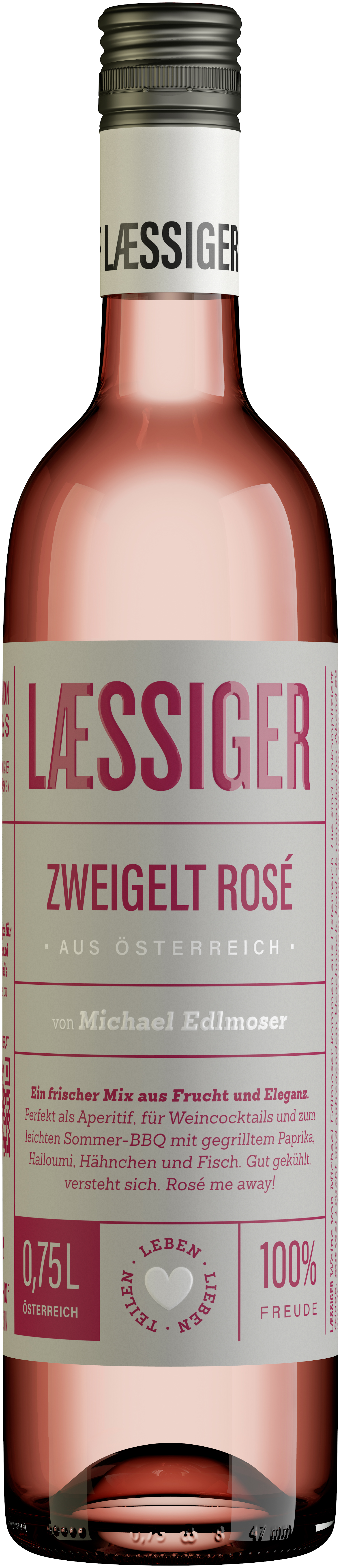 Helles Lachsrosa, Silberreflexe - ein Rosé ganz im frischen, unkomplizierten Laessiger-Stil. Rotes Waldbeerkonfit, Nuancen von eingelegten Kirschen und Erdbeeren, ein Hauch von Blütenhonig. Der Zweigelt Rosé präsentiert sich mit zarten roten Fruchtnoten am Gaumen, einem frischen Säurebogen und angenehmen Honignuancen im Abgang. Das ist ein idealer Sommerwein mit zitronigem Nachhall.